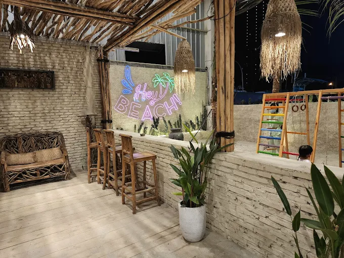 HeyBeach mengusung desain tropis modern: banyak elemen kayu, warna cerah, dekorasi laut, serta lampu hangat yang menciptakan kenyamanan khas pesisir. Musik yang diputar pun dipilih untuk memperkuat ambience santai tanpa mengganggu aktivitas Anda.